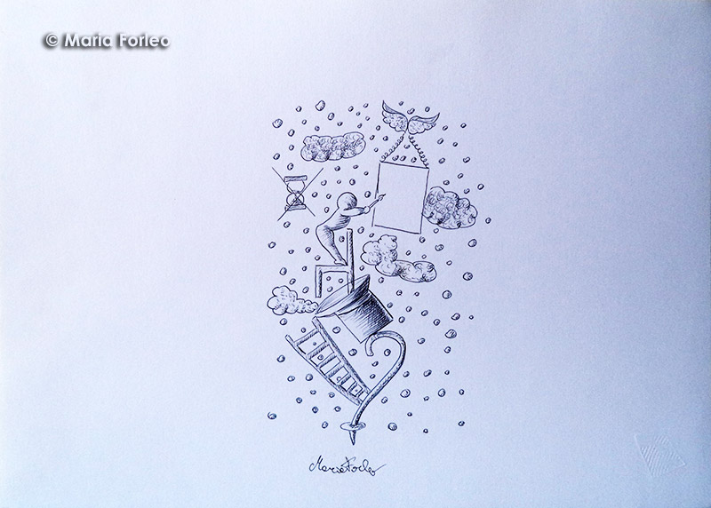 PRESENTAZIONE DELL’OPERA : in questo disegno l’omino sembra aver scelto il modo più complicato per iniziare la sua opera, tutto è instabile. A partire dal basso, notiamo subito che una puntina dalla testa piatta sorregge un bastone-punto di domanda, che a sua volta sorregge una scala e insieme a quest’ultima sorregge un cilindro. Il cappello, come i cilindri magici, opsita un mondo a se; in questo caso dal cappello fuoriesce una sedia, anch’essa dall’equilibrio incerto, su di essa, quasi in punta di piedi, si ritrova l’omino dei punti interrogativi. L’esserino dalla testa tonda è proteso in avanti per cercare di tracciare le prime linee della sua opera col suo pennello. Ma la tela su cui vuole dipingere non è ben salda su un cavalletto, come per il resto del dipinto, anche per la tela vince l’equilibrio instabile, dato dall’oscillare della corda a cui la tela è attaccata, corda sorretta da delle ali. Altri elmenti curiosi presenti nell’illustrazione sono la clessidra in alto a sinistra, sbarrata, è come se al momento il tempo che passa non sia un problema, anzi non esite, è eliminato. Ci sono anche delle nubi scure attorno all’omino e delle palline che scendono come neve. Ad uno sguardo più attento saremmo portati a pensare che quei puntini possano essere, non solo semplici fiocchi di neve, ma un caotico insieme di punti di riflessione. L’illustratrice Maria Forleo, con dei semplici elementi, ci apre un mondo di riflessioni.
