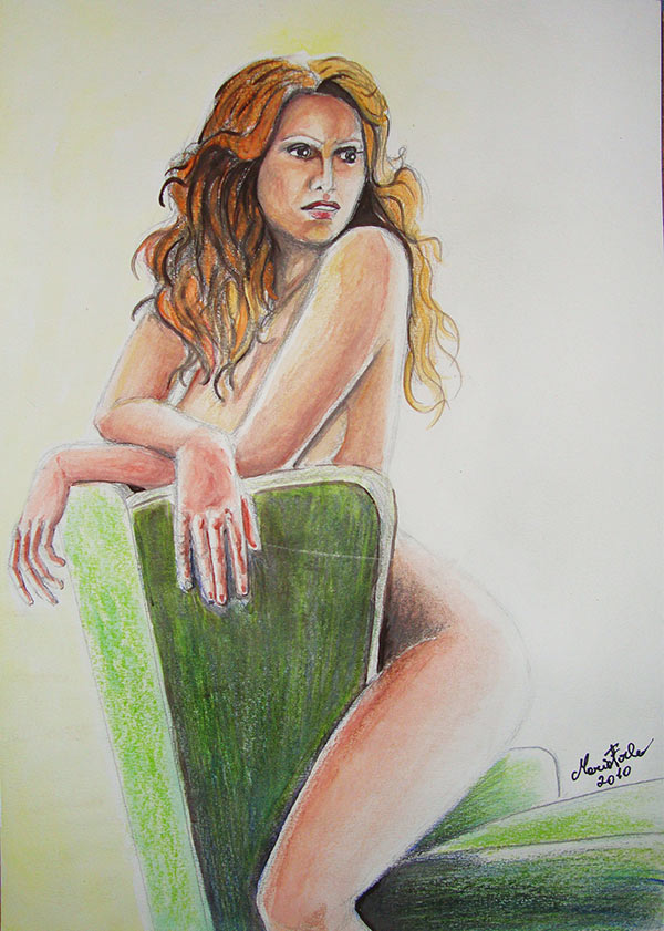 Il disegno raffigura una donna seducente a cavalcioni su un apoltrona verde. Il nudo non è volgare, la femminilità della donna è data più dalla folta chioma rossa che dalle sue forme sinuose o dal sesso celato. IL suo sguardo è volto quasi indietro invece che verso l’osservatore o dinnanzi a lei. Guarda, qualcuno o qualcosa o semplicemente assorta nei suoi pensieri?