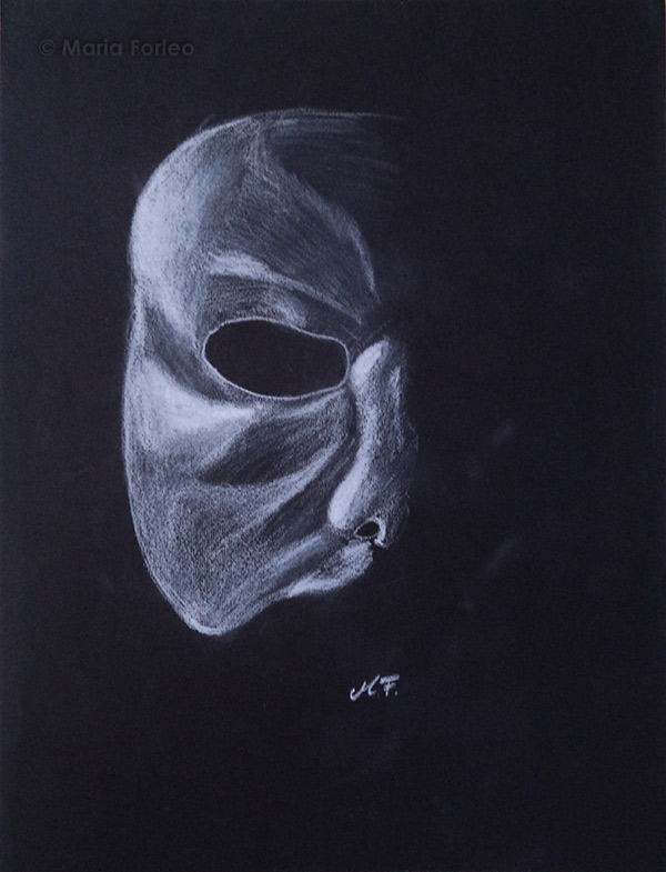 PRESENTAZIONE DELL’OPERA : Il disegno ritrae la maschera che nell’immaginario dell’artista indossa Erik, il fantasma dell’Opera, signore delle botole, come viene più volte definito nel famosissimo romanzo omonimo di Gaston Leroux, a cui si sono ispirati molti registri teatrali e cinematografici. Basta solo questa maschera bianca che emerge dal fondo scuro a simulare il mistero che aleggia intorno al personaggio e trasmetterne tutta la forza.