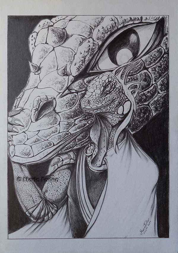 PRESENTAZIONE DELL’OPERA : Il disegno ritrae il guerrioro Kadal con il suo fido destriero sauro. Il nome del guerriero ha origini indonesiane e significa lucertola. Il combattente sembra felice accanto al suo fido compagno di avventure e queest’ultimo sembra ricambiare la stessa fiducia, sono infatti entrambi sorridenti. Che siano legati uno all’altro è facilmente comprensibile, dato che Kadal pone la mano sul muso del destriero, esattamente come farebbe un comune cavaliere per accarezzare il cavallo adorato.