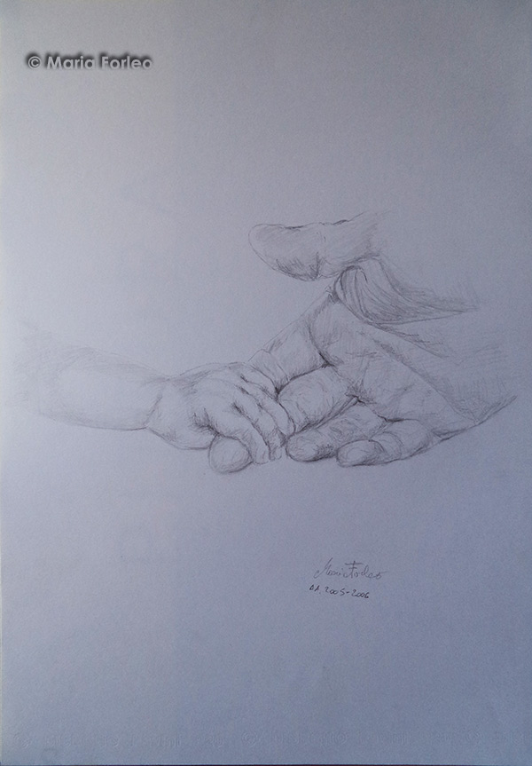 PRESENTAZIONE DELL’OPERA : Il disegno a matita ritrae la mano di un piccolo nella mano di un adulto, è l’inizio di un lungo cammino, almeno è quello che ci si augura. Il compito dell’adulto è di aiutare il piccolo nel suo cammino di vita, indirizzandolo nel miglior modo possibile sulla retta via finche non sarà abbastanza maturo da proseguire da solo. È ritratto un comune gesto che racchiude un mondo di emozioni e sensazioni: sicurezza, forza, coraggio, amore, protezione e così via.