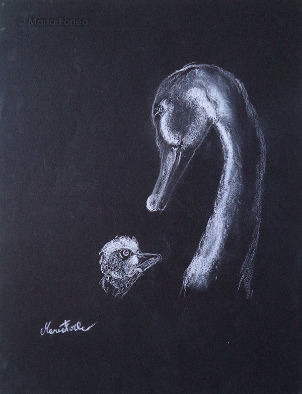 PRESENTAZIONE DELL’OPERA : l’illustrazione, realizzata con matite bianche e gesso su un cartoncino nero, mette in evidenza l’amor materno del mondo animale. L’osservatore nota che mamma e figlio si guardano negli occhi. Il piccolo che, come la maggior parte dei cuccioli pennutti, è abbastanza bruttino, sembra chiedere qualcosa alla madre che è già pronta a rassicurarlo.