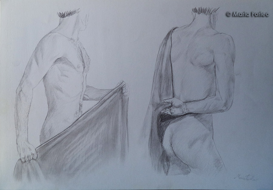 PRESENTAZIONE DELL’OPERA : il disegno è focalizzato sullo studio del corpo maschile. L’attenzione è incentrata sul busto dell’uomo visto in due posizioni differenti per poterne meglio notare le fattezze anatomiche
