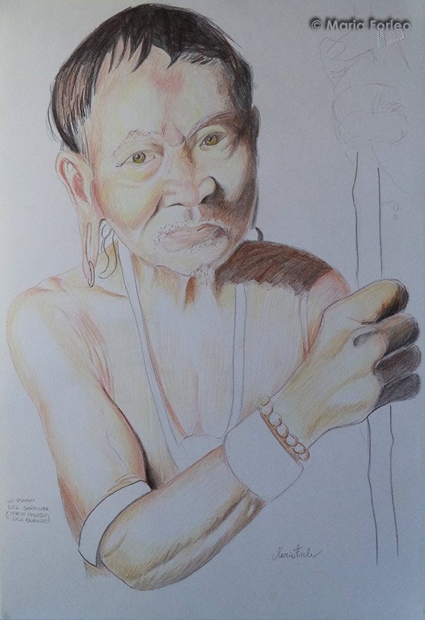 PRESENTAZIONE DELL’OPERA : l’illustrazione rappresenta la fisionomia di un Punan del Sarawak (parte malese del Borneo). Il Punan è poggiato ad un bastone, che però è solo accennato come la sua mano sinistra. L’illustratrice ha voluto dare risalto più al volto del soggetto, al suo braccio destro, al suo collo rugoso e a parte del suo busto, questo per mettere in risalto parte dell’abbilgiamento tipico indigeno. Si nota anche l’usanza di perforare il lobo dell’orecchio, sino a deformarlo con un evidente e grande orifizio attraversato da un orecchino. L’osservatore nota che anche l’orecchio destro è agghigliato da un orecchino, difatti lo si intravede appena dietro la spalla del personaggio.