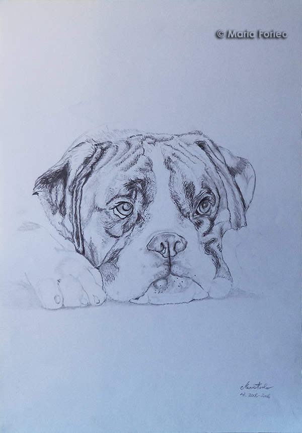 PRESENTAZIONE DELL’OPERA :il disegno a matita ritrae un cane san bernardo steso per terra col muso sul pavimento. I suoi occhi, un po’ malinconici, catturano subito l’attenzione di chi lo guarda. L’abile tratto della matita ci trasmette la morbidezza del manto peloso dell’animale, peluria intervallata da diverse pieghe che accentuano l’espressione mimica del cucciolone. Per non distogliere l’attenzione dell’osservatoe dal volto del san bernardo, la disegnatrice sceglie di non rifinire il resto del corpo del cane ma lo accenna solo per darne un’idea.