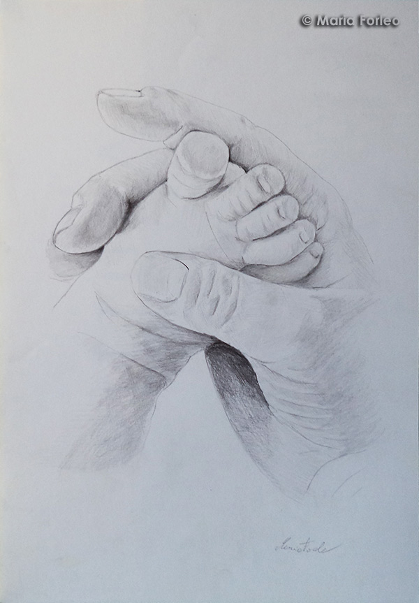 PRESENTAZIONE DELL’OPERA : il titolo del disegno a matita rende l’idea di cosa la disegnatrice abbia cercato di comunicare col soggetto raffigurato. E ,infatti, osservando questo piccolo piede in una mano di un adulto, non possiamo che intenerirci. La matita è stesa con delicatezza, senza creare troppi contrasti chiaroscurali, ma il tutto è ben realizzato per ottenere il risultato armonico sperato.