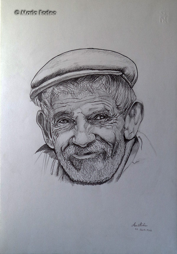 PRESENTAZIONE DELL’OPERA : Il disegno a matita raffigura un volto di un uomo anziano che indossa una coppola. Le rughe popolano il volto dell’uomo consentendo all’artista di divertirsi nel realizzare i chiaro-scuri dovuti. L’espressione del vecchietto è un espressione felice; gli zigomi sono alti per il sorriso dischiuso che ci mostra una dentatura ormai incerta. L’osservatore percepisce il candore dei capelli visibili sotto il cappello e della peluria che riveste il mento e circonda le labbra. Il resto dell’abbigliamento è accennato per non distogliere lo sguardo dell’osservatore dal volto del personaggio disegnato.